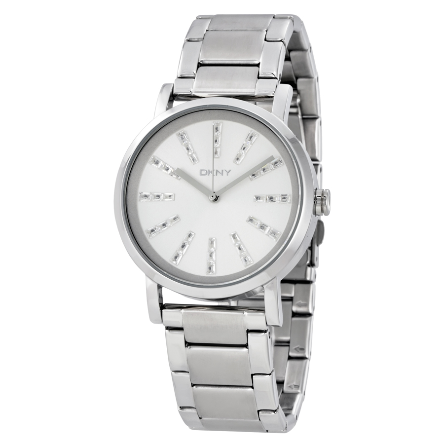 Stainless steel case with a stainless steel bracelet. Fixed stainless steel bezel. Silver dial with silver-tone hands and baguette crystal-set index hour markers. Dial Type: Analog. Quartz movement. Scratch resistant mineral crystal. Pull / push crown. Solid case back. Case size: 38 mm. Case thickness: 11 mm. Round case shape. Band width: 20 mm. Deployment with push button release clasp. Water resistant at 50 meters / 165 feet. Functions: hour, minute, second. Dress watch style. DKNY Soho Silver Dial Stainless Steel Ladies Watch NY2416.