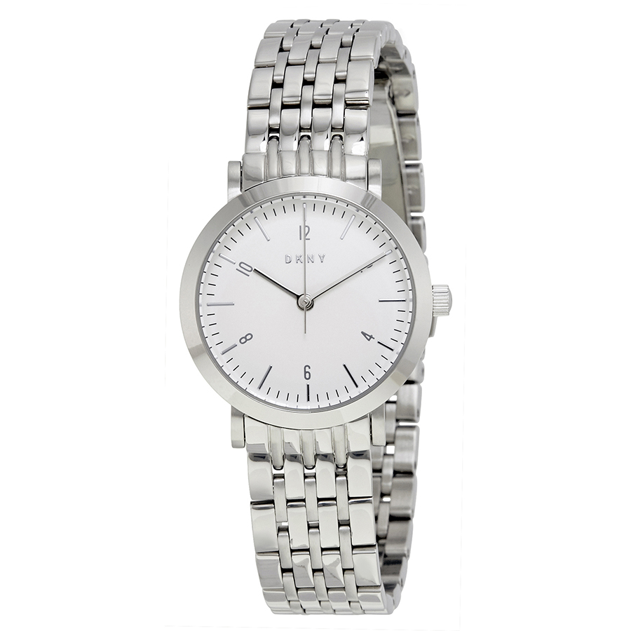 Stainless steel case with a stainless steel bracelet. Fixed stainless steel bezel. White dial with silver-tone hands and index / small Arabic numeral hour markers. Minute markers around the outer rim. Dial Type: Analog. Quartz movement. Scratch resistant mineral crystal. Pull / push crown. Solid case back. Case size: 28 mm. Case thickness: 6 mm. Round case shape. Band width: 14 mm. Deployment clasp with a push button release. Water resistant at 50 meters / 165 feet. Functions: hour, minute, second. Casual watch style. DKNY Minetta White Dial Ladies Watch NY2509.