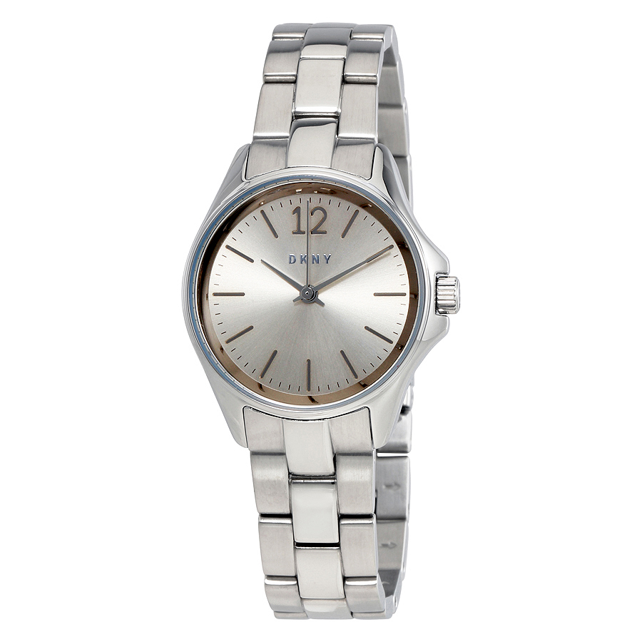 Stainless steel case with a stainless steel bracelet. Fixed stainless steel bezel. Grey sunray dial with silver-tone hands and index hour markers. An Arabic numeral appears at the 12 o'clock position. Minute markers around the outer rim. Dial Type: Analog. Quartz movement. Scratch resistant mineral crystal. Pull / push crown. Solid case back. Case size: 30 mm. Case thickness: 6 mm. Round case shape. Band width: 16 mm. Band length: 8 inches. Deployment clasp with a push button release. Water resistant at 50 meters / 165 feet. Functions: hour, minute, second. Casual watch style. DKNY Eldridge Grey Sunray Dial Ladies Watch NY2522.