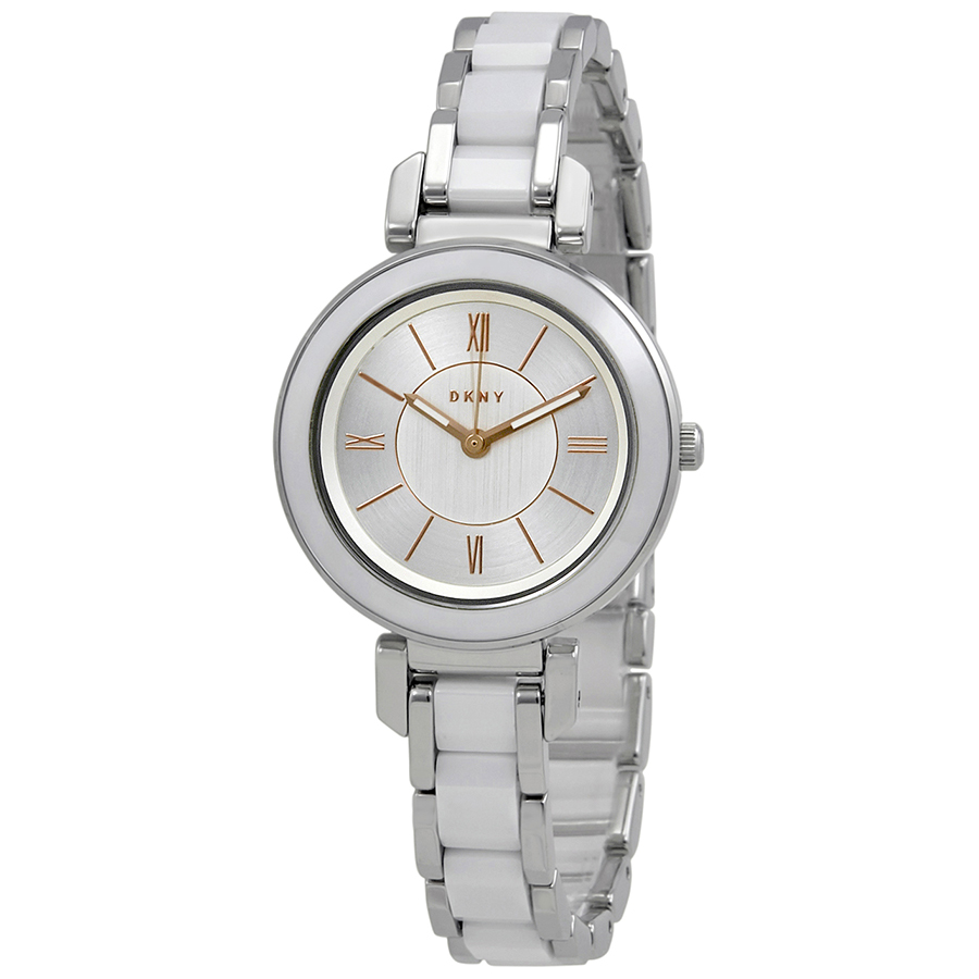 Stainless steel case with a stainless steel bracelet with white ceramic center links. Fixed stainless steel bezel with a white ceramic inlay. Silver dial with luminous rose gold-tone hands and index hour markers. Roman numerals mark the 3, 6, 9 and 12 o'clock positions. Dial Type: Analog. Luminescent hands. Quartz movement. Scratch resistant mineral crystal. Pull / push crown. Solid case back. Case size: 30 mm. Case thickness: 7 mm. Round case shape. Band width: 10 mm. Deployment clasp with a push button release. Water resistant at 50 meters / 165 feet. Functions: hour, minute, second. Dress watch style. DKNY Ellington Silver Dial Stainless Steel and White Ceramic Ladies Watch NY2588