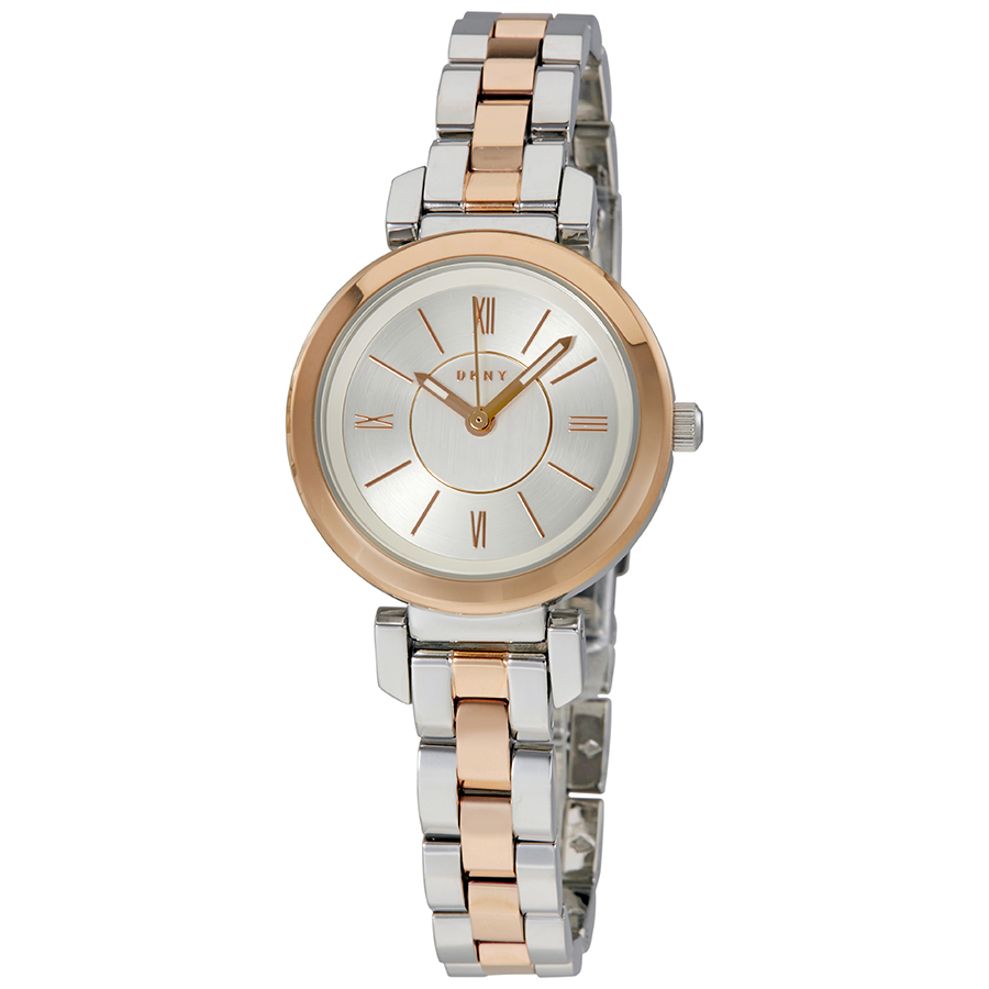 Rose gold-tone stainless steel case with a two-tone (silver-tone and rose gold-tone) stainless steel bracelet. Fixed rose gold-tone stainless steel bezel. Silver dial with luminous rose gold-tone hands and index hour markers. Roman numerals mark the 3, 6, 9 and 12 o'clock positions. Dial Type: Analog. Luminescent hands. Quartz movement. Scratch resistant mineral crystal. Pull / push crown. Solid case back. Round case shape. Case size: 28 mm. Case thickness: 6 mm. Band width: 10 mm. Deployment clasp with a push button release. Water resistant at 50 meters / 165 feet. Functions: hour, minute, second. Casual watch style. DKNY Ellington Quartz Silver Dial Ladies Watch NY2593.
