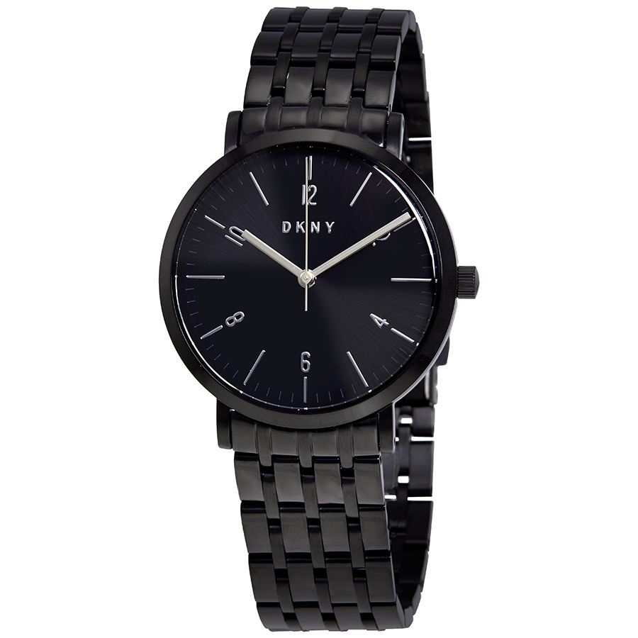 Black ion-plated stainless steel case and bracelet. Fixed black ion-plated bezel. Black dial with silver-tone hands and index / Arabic numeral hour markers. Minute markers around the outer rim. Dial Type: Analog. Quartz movement. Scratch resistant mineral crystal. Pull / push crown. Solid case back. Round case shape. Case size: 36 mm. Case thickness: 8 mm. Band width: 18 mm. Deployment clasp with a push button release. Water resistant at 50 meters / 165 feet. Functions: hour, minute, second. Casual watch style. DKNY Minetta Black Dial Ladies Watch NY2612.