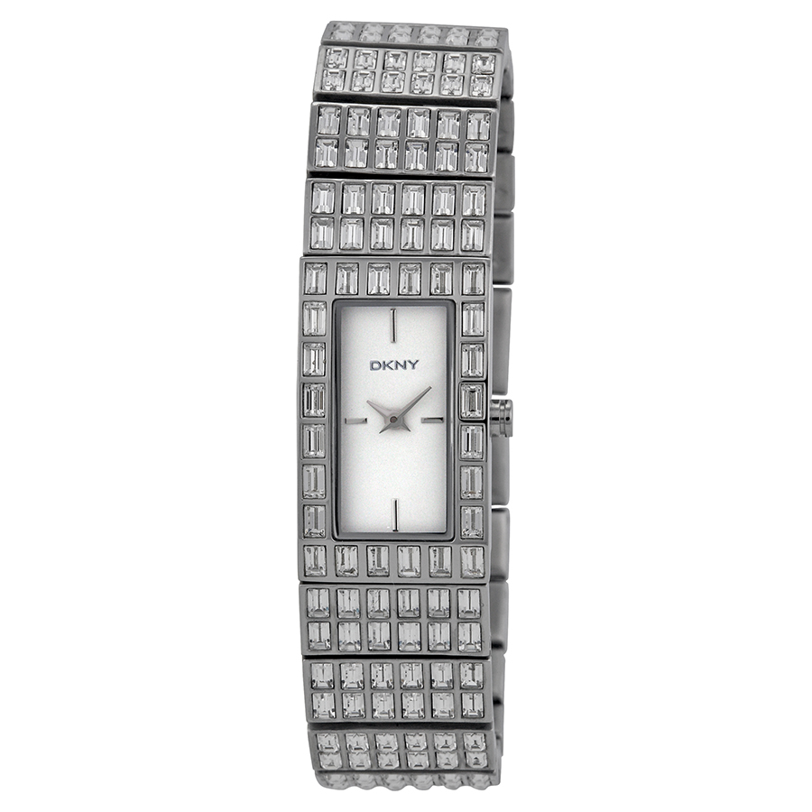 Stainless steel case with a stainless steel bracelet set with crystals. Fixed stainless steel bezel set with crystals. White dial with silver-tone dauphine-style hands. Index markers at the 3, 6, 9 and 12 o'clock positions. Dial Type: Analog. Quartz movement. Scratch resistant mineral crystal. Pull / push crown. Solid case back. Rectangle case shape. Case dimensions: 30 mm x 18 mm. Case thickness: 8 mm. Band width: 15 mm. Jewelry clasp. Water resistant at 50 meters / 165 feet. Functions: hours, minutes. Dress watch style. DKNY White Dial Stainless Steel Crystal Ladies Watch NY8299.
