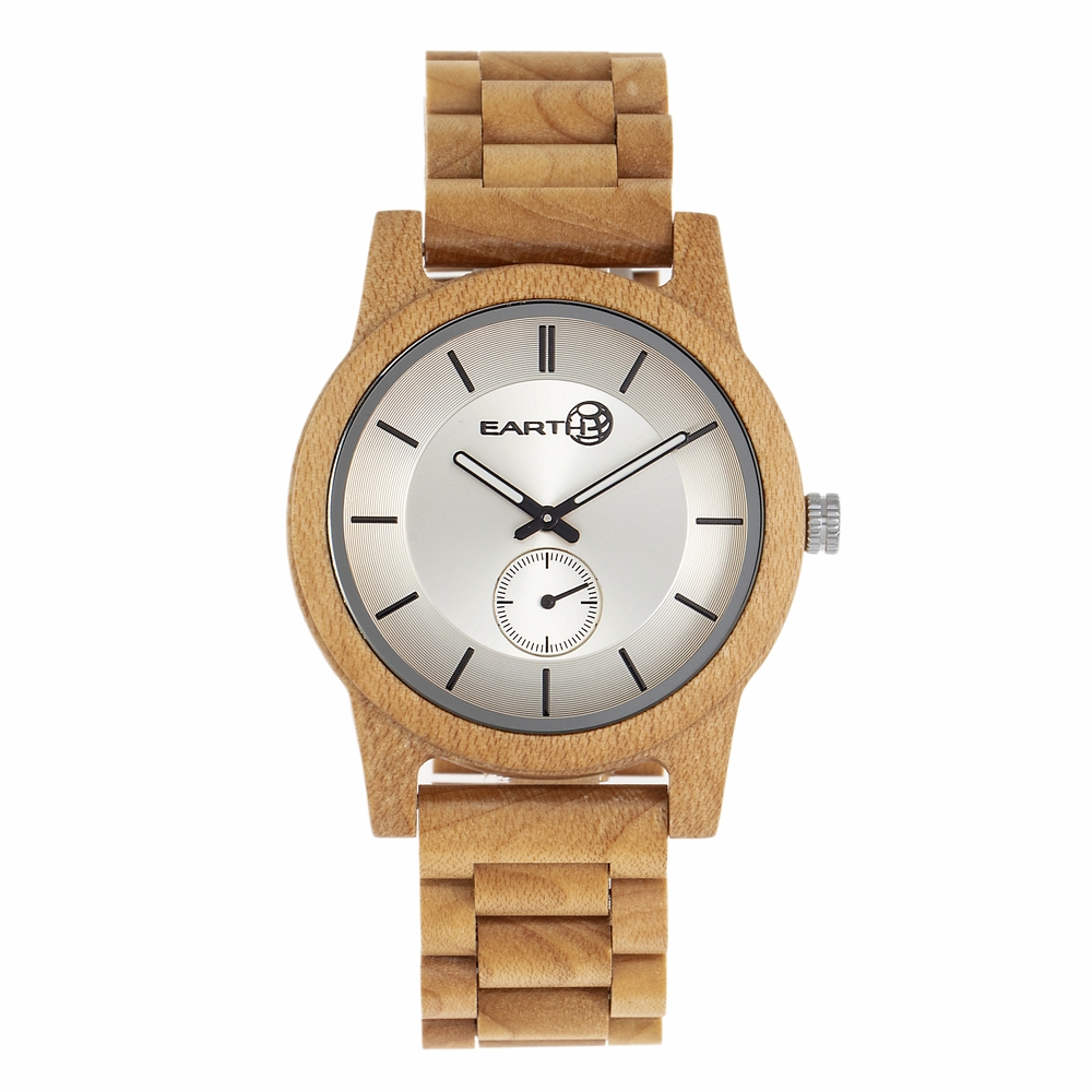 Khaki/tan wood case with a khaki/tan wood bracelet. Fixed khaki/tan wood bezel. Silver-tone dial with black hands and index hour markers. Dial Type: Analog. Luminescent hands. One - small second subdial. Quartz movement. Scratch resistant mineral crystal. Pull / push crown. Solid case back. Round case shape, case size: 42 mm, case thickness: 11 mm. Band width: 20 mm. Push button deployment clasp. Water resistant at 30 meters / 100 feet. Functions: hour, minute, small second. Casual watch style. Watch label: Japan Movt. Earth Blue Ridge Quartz Silver Dial Unisex Watch ETHEW5801.