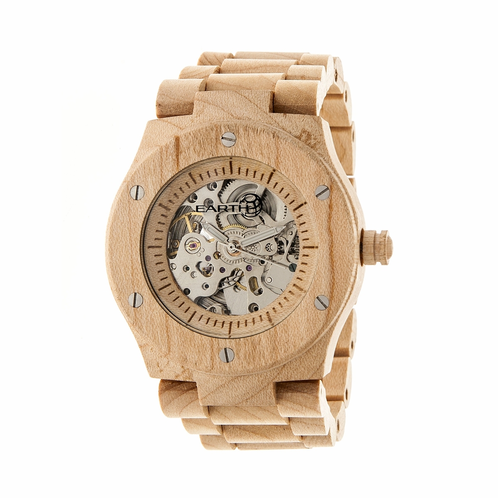 Khaki/tan wood case with a khaki/tan wood bracelet. Fixed khaki/tan wood bezel. Silver-tone dial with silver-tone hands. Minute markers around the outer rim. Dial Type: Analog. Luminescent hands. Automatic movement. Scratch resistant mineral crystal. Transparent case back. Round case shape, case size: 44 mm, case thickness: 15 mm. Band width: 28 mm. Butterfly clasp. Water resistant at 30 meters / 100 feet. Functions: hour, minute, second. Casual watch style. Earth Grand Mesa Automatic Silver Dial Watch ETHEW3101.