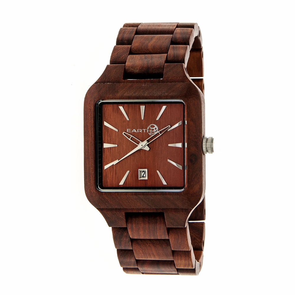 Red wood case with a red wood bracelet. Fixed red bezel. Red dial with silver-tone hands and index hour markers. Minute markers around the outer rim. Dial Type: Analog. Luminescent hands. Date display at the 6 o'clock position. Quartz movement. Scratch resistant mineral crystal. Square case shape, case size: 39 mm, case thickness: 13 mm. Band width: 25 mm. Jewelry clasp. Functions: date, hour, minute, second. Dress watch style. Earth Arapaho Red Dial Watch ETHEW3603.