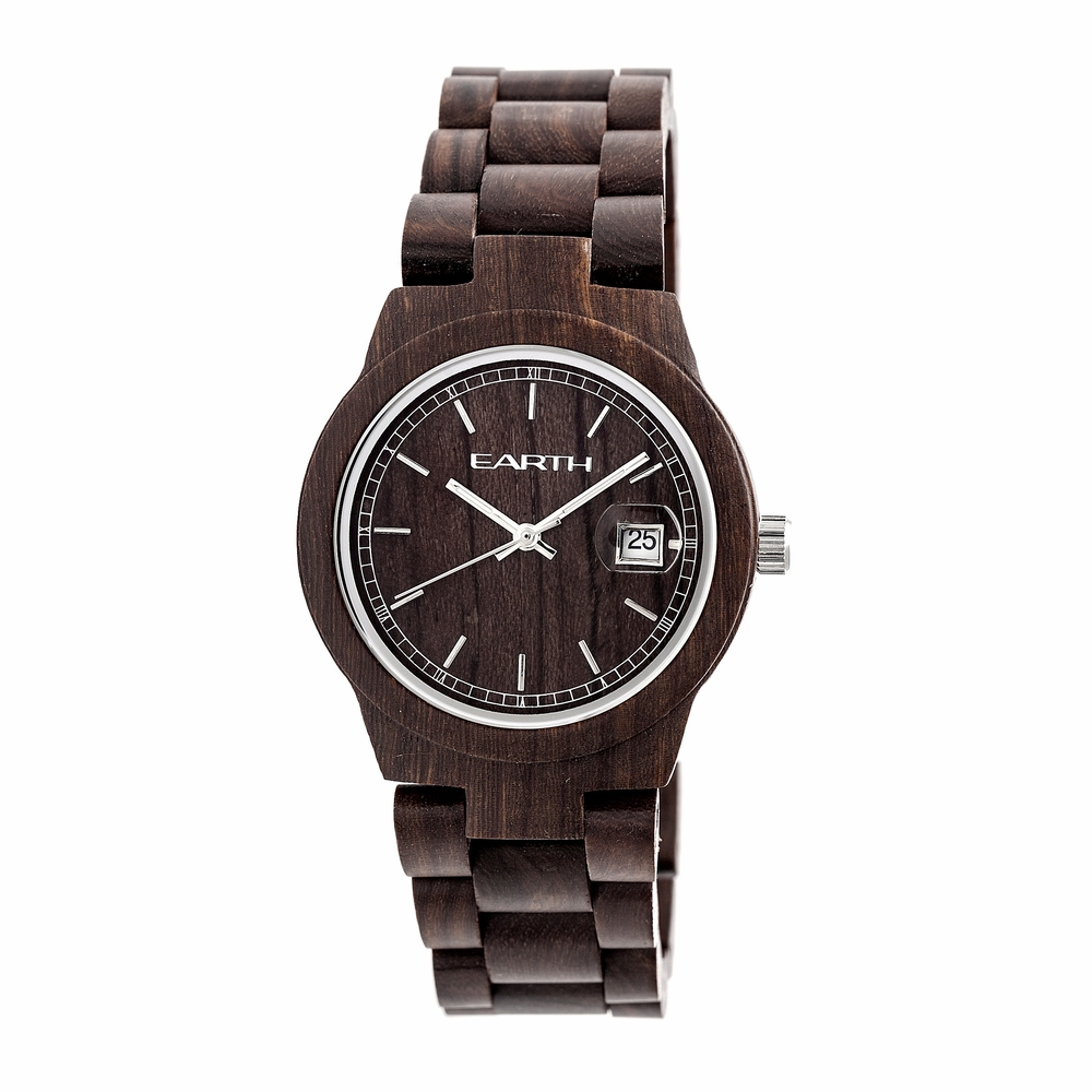 Dark brown wood case with a dark brown wood bracelet. Fixed dark brown bezel. Dark brown dial with silver-tone hands and index hour markers. Minute markers around the outer rim. Dial Type: Analog. Date display at the 3 o'clock position. Quartz movement. Scratch resistant mineral crystal. Round case shape, case size: 38 mm, case thickness: 10 mm. Band width: 22 mm. Jewelry clasp. Functions: date, hour, minute, second. Dress watch style. Watch label: Japan Movt. Earth Biscayne Watch ETHEW4202.