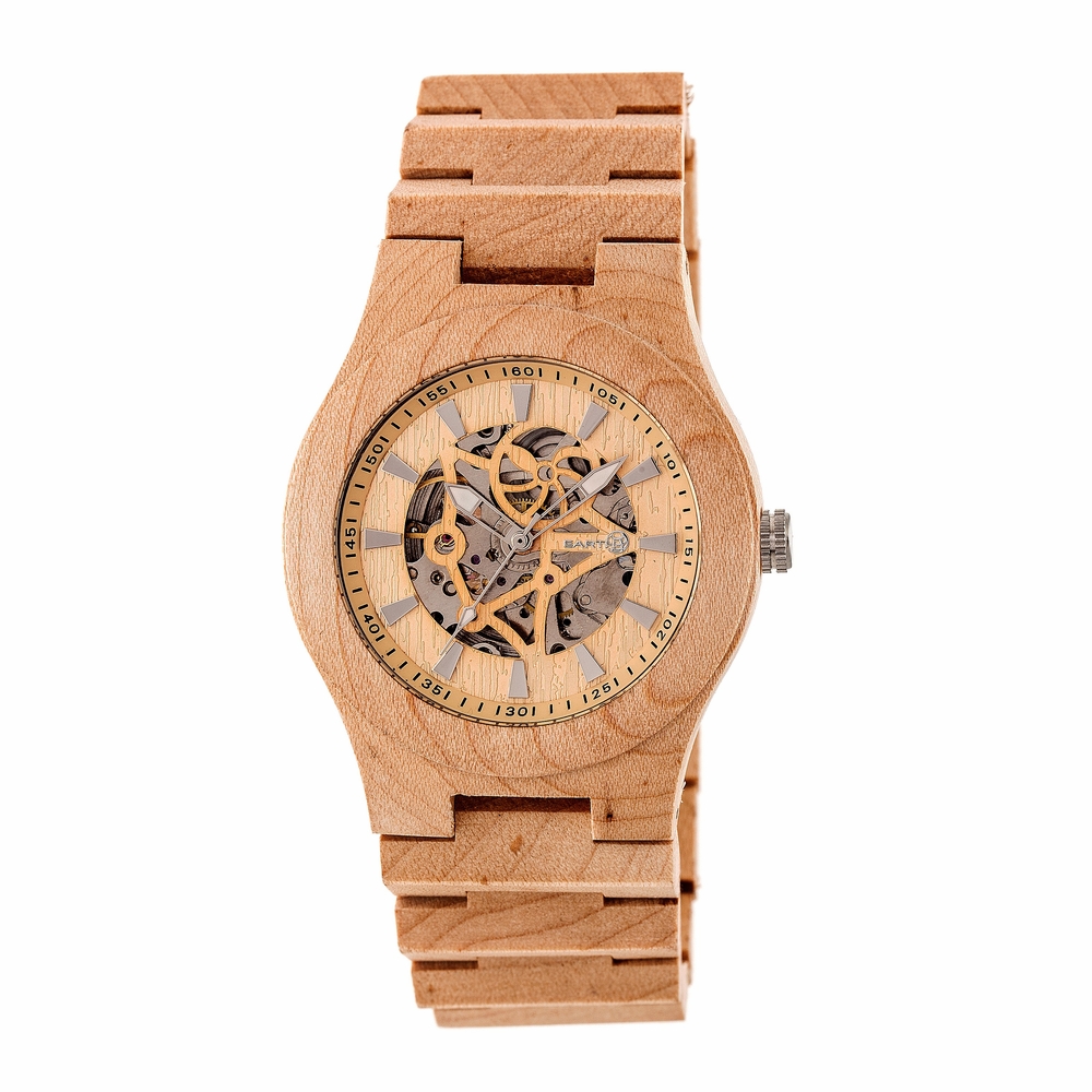 Khaki/tan wood case with a khaki/tan wood bracelet. Fixed khaki/tan bezel. Khaki/tan dial with silver-tone hands and index hour markers. Minute markers around the outer rim. Dial Type: Analog. Luminescent hands and markers. Automatic movement. Scratch resistant mineral crystal. Transparent case back. Round case shape, case size: 45 mm, case thickness: 15 mm. Band width: 28 mm. Fold over push button deployment clasp. Water resistant at 30 meters / 100 feet. Functions: hour, minute, second. Dress watch style. Earth Gobi Automatic Watch ETHEW4301.