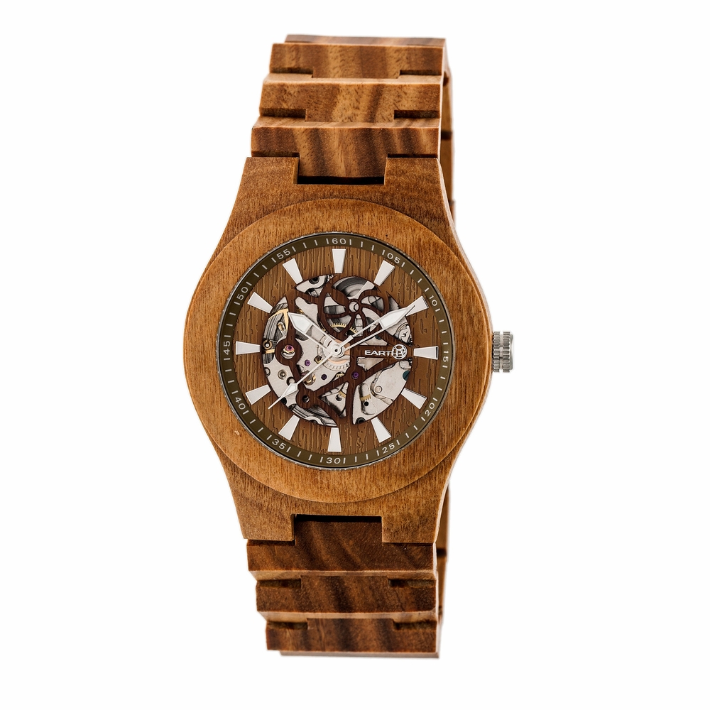 Olive wood case with a olive wood bracelet. Fixed olive bezel. Olive dial with silver-tone hands and index hour markers. Minute markers around the outer rim. Dial Type: Analog. Luminescent hands and markers. Automatic movement. Scratch resistant mineral crystal. Transparent case back. Round case shape, case size: 45 mm, case thickness: 15 mm. Band width: 28 mm. Fold over push button deployment clasp. Water resistant at 30 meters / 100 feet. Functions: hour, minute, second. Dress watch style. Earth Gobi Automatic Watch ETHEW4304.