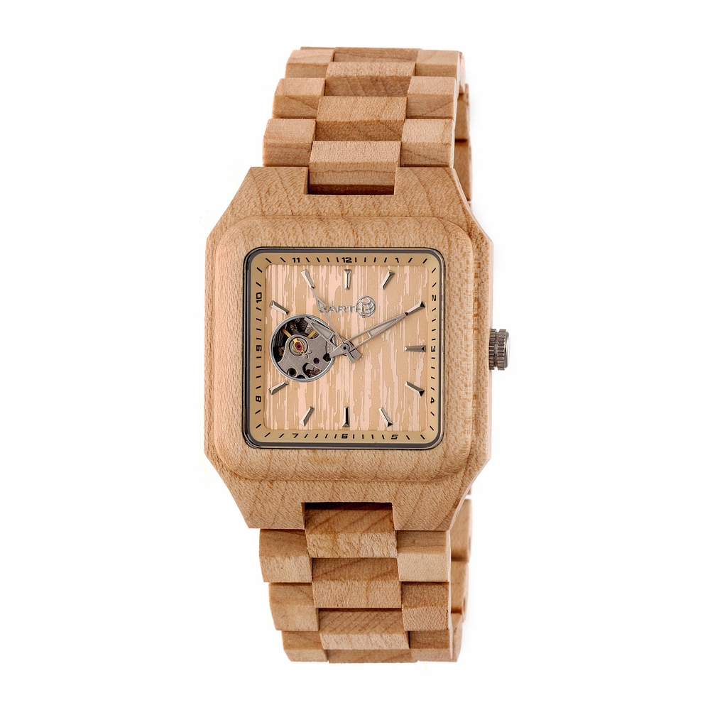 Khaki/tan wood case with a khaki/tan wood bracelet. Fixed khaki/tan bezel. Khaki/tan dial with silver-tone hands and index hour markers. Minute markers around the outer rim. Dial Type: Analog. Luminescent hands. Automatic movement. Scratch resistant mineral crystal. Transparent case back. Rectangle case shape, case size: 42 mm, case thickness: 15 mm. Band width: 28 mm. Fold over push button deployment clasp. Water resistant at 30 meters / 100 feet. Functions: hour, minute, second. Dress watch style. Earth Black Rock Automatic Watch ETHEW4401.