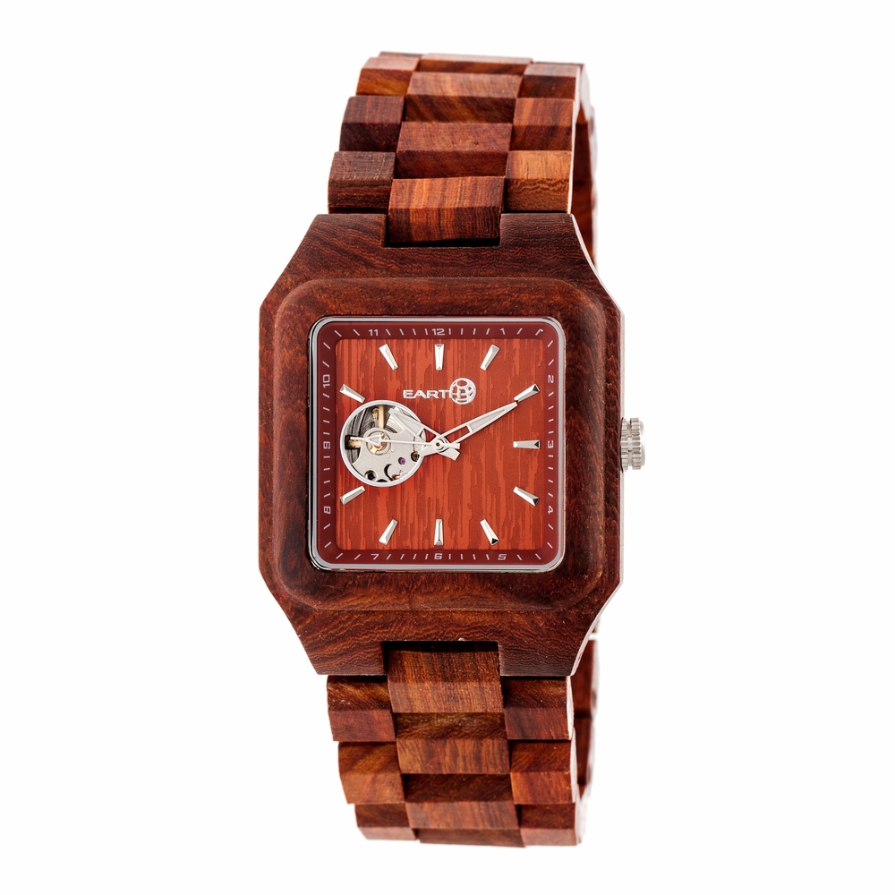 Red wood case with a red wood bracelet. Fixed red bezel. Red dial with silver-tone hands and index hour markers. Minute markers around the outer rim. Dial Type: Analog. Luminescent hands. Automatic movement. Scratch resistant mineral crystal. Transparent case back. Square case shape, case size: 42 mm, case thickness: 15 mm. Band width: 28 mm. Fold over push button deployment clasp. Water resistant at 30 meters / 100 feet. Functions: hour, minute, second. Dress watch style. Earth Black Rock Automatic Red Dial Watch ETHEW4403.