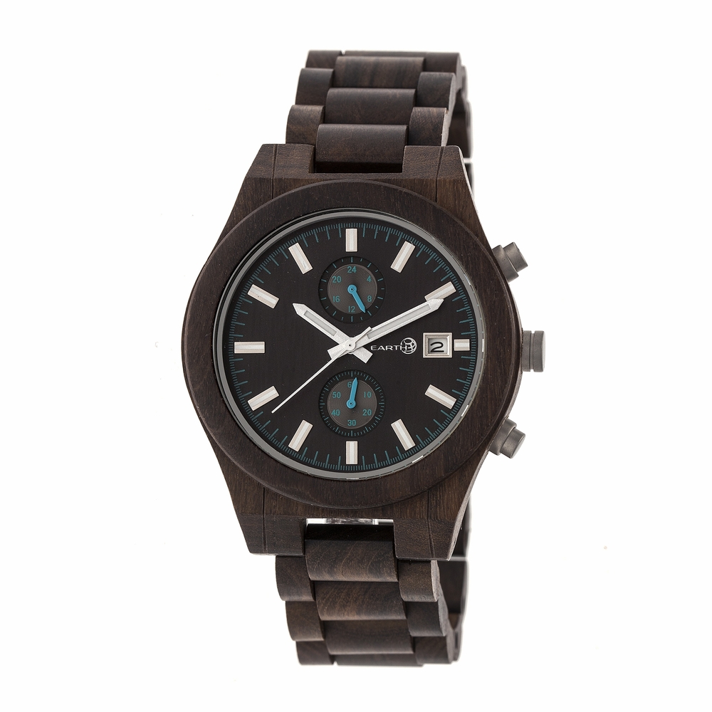 Dark brown wood case with a dark brown wood bracelet. Fixed dark brown wood bezel. Dark brown dial with luminous silver-tone hands and index hour markers. Minute markers around the outer rim. Dial Type: Analog. Luminescent hands and markers. Date display at the 3 o'clock position. Chronograph - two sub-dials displaying: 24 hour and 60 second. Quartz movement. Scratch resistant mineral crystal. Pull / push crown. Solid case back. Round case shape. Case size: 45 mm. Case thickness: 14 mm. Band width: 21 mm. Push button deployment clasp. Water resistant at no resistance. Functions: chronograph, date, GMT, second time zone, hour, minute, second. Castillo Series. Dress watch style. Watch label: Japan Movt. Earth Castillo Chronograph Dark Brown Dial Watch ETHEW5102.