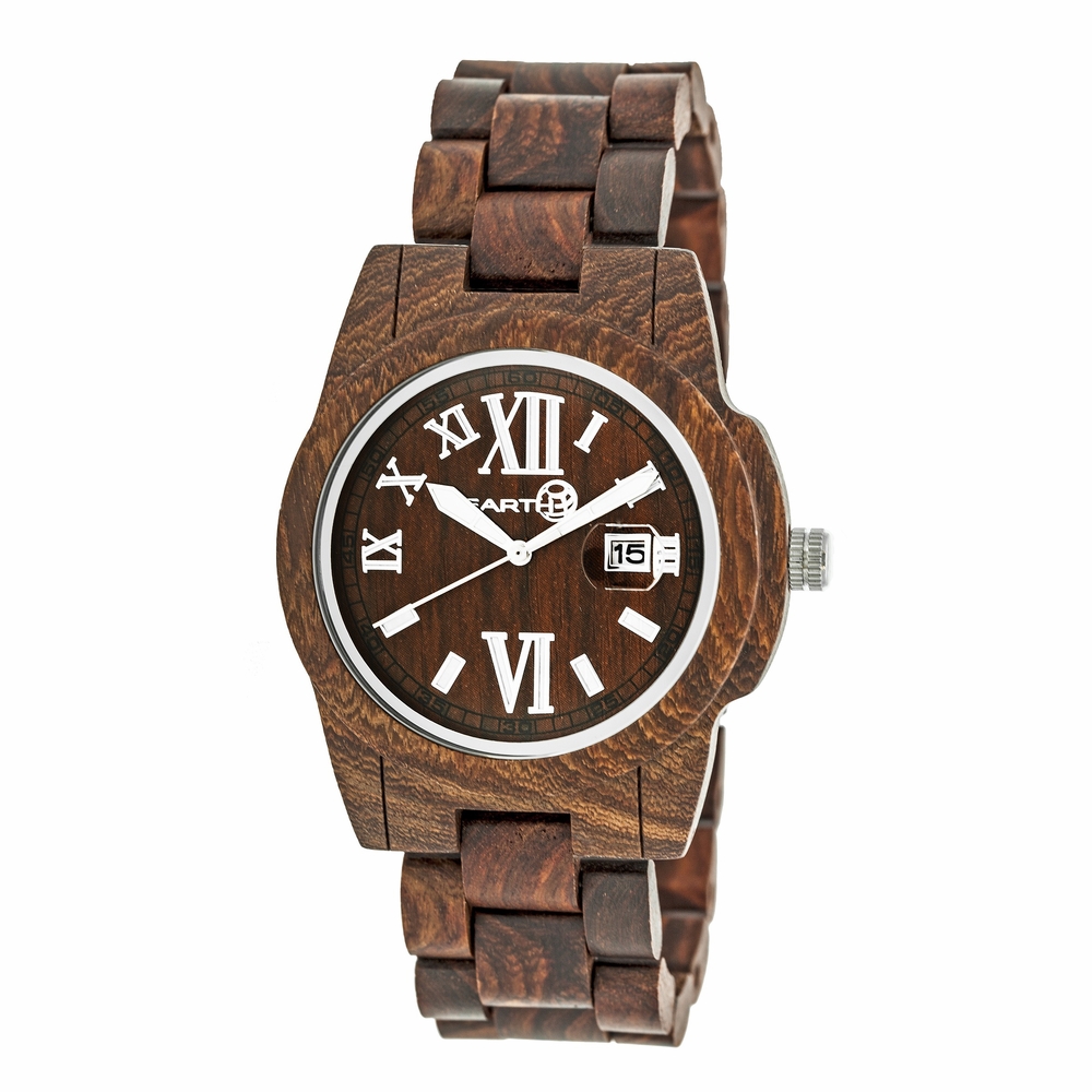 Eco-friendly red wood case with a red wood bracelet. Fixed red wood bezel. Red dial with silver-tone hands and Roman numeral/index hour markers. Minute markers around the outer rim. Dial Type: Analog. Luminescent markers. Date display at the 3 o'clock position. Quartz movement. Scratch resistant mineral crystal. Solid wood case back. Case diameter: 43 mm. Case thickness: 13 mm. Round case shape. Band width: 22 mm. Deployment clasp with push button release. No water resistance. Functions: date, hour, minute, second. Additional Info: due to seasons and aging of wood, colors may be darker or lighter than pictured.. Casual watch style. Earth Heartwood Eco-Friendly Dark Brown Wood Heartwood Unisex Watch EW1503.