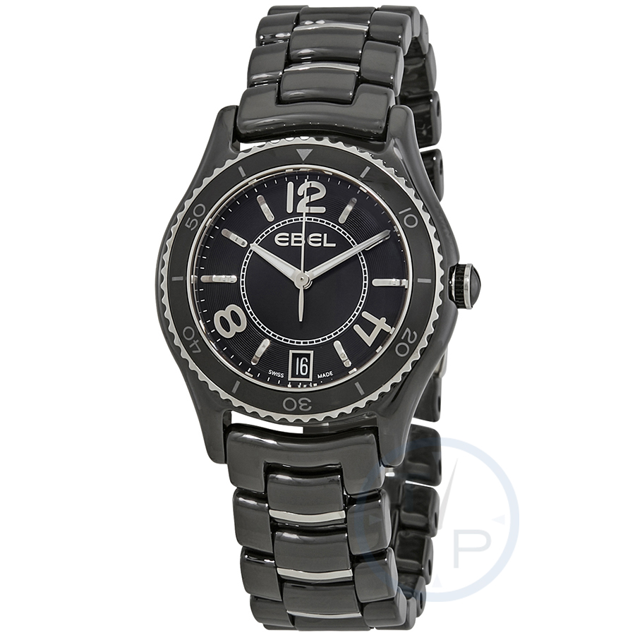 Black ceramic case with a black ceramic and stainless steel bracelet. Uni-directional rotating coin edge stainless steel bezel with a black ceramic count-up elapsed time top ring. Black dial with luminous silver-tone hands and index hour markers. Arabic numerals mark the 4, 8 and 12 o'clock positions. minute markers around the outer rim. Dial Type: Analog. Luminescent hands. Date display at the 6 o'clock position. Quartz movement. Scratch resistant anti-reflective sapphire crystal. Pull / push crown. Solid case back. Round case shape, case size: 34 mm, case thickness: 10 mm. Band width: 17 mm. Deployment clasp. Water resistant at 100 meters / 330 feet. Functions: date, hour, minute, second. Additional Info: suitable for swimming and showering. X-1 Series. Luxury watch style. Watch label: Swiss Made. Ebel X-1 Black Dial Black Ceramic and Steel Ladies Watch 1216142.
