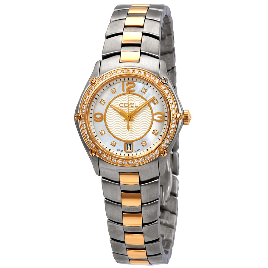 Stainless steel case with a stainless steel bracelet with 18kt yellow gold center links. Fixed 18kt yellow gold bezel set with diamonds. Mother of pearl (silver guilloche centerted) dial with luminous yellow gold-tone hands and diamond hour markers. Arabic numerals mark the 3, 9 and 12 o'clock positions. Minute markers around the outer rim. Dial Type: Analog. Date display at the 6 o'clock position. Quartz movement. Scratch resistant sapphire crystal. Solid case back. Round case shape. Case size: 27 mm. Deployment clasp. Water resistant at 50 meters / 165 feet. Functions: date, hour, minute, second. Luxury watch style. Watch label: Swiss Made. Ebel Sport Mother of Pearl Diamond Dial Ladies Two Tone Watch 1216184.