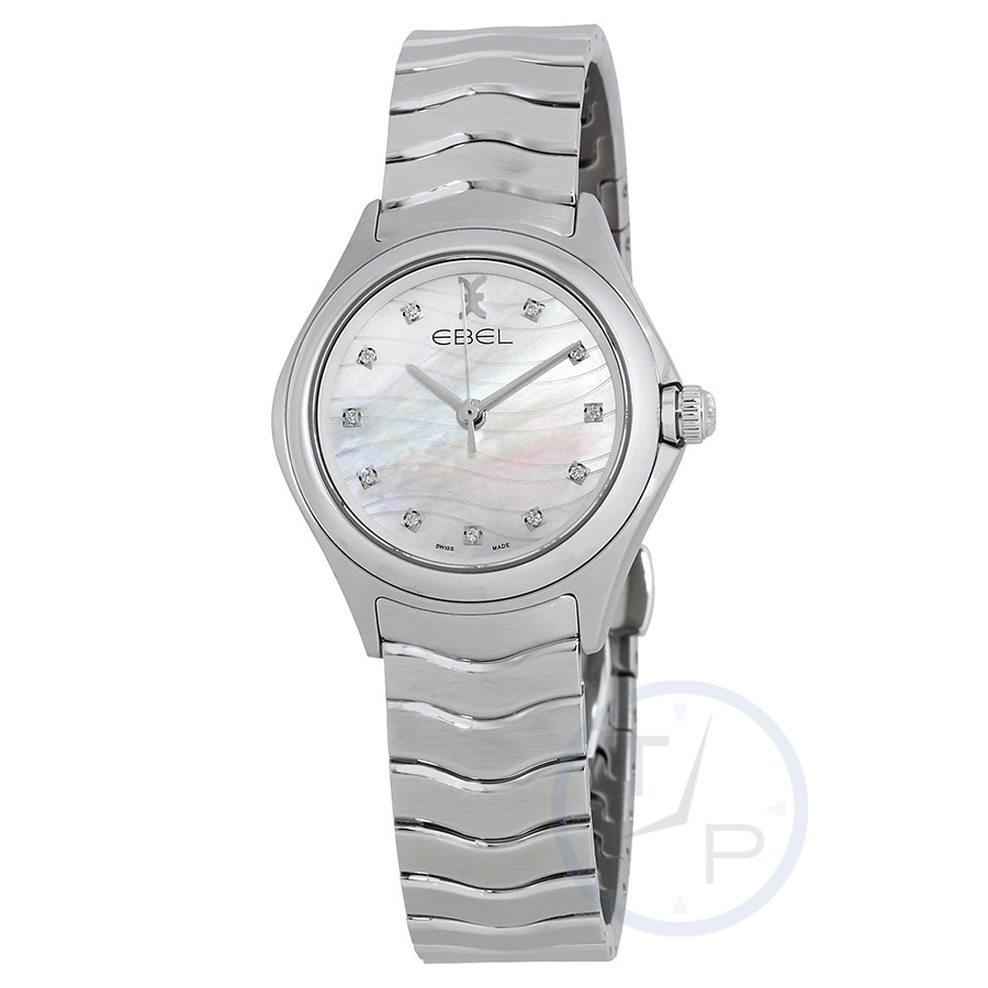 Stainless steel case with a stainless steel bracelet. Fixed stainless steel bezel. Mother of pearl dial with silver-tone hands and 11 diamond hour markers. Dial Type: Analog. Quartz movement. Scratch resistant sapphire crystal. Pull / push crown. Solid case back. Round case shape. Case size: 30 mm. Case thickness: 8 mm. Band width: 15 mm. Deployment clasp. Water resistant at 50 meters / 165 feet. Functions: hour, minute, second. Additional Info: dial set with 11 diamonds (0.043 carats). Dress watch style. Watch label: Swiss Made. Ebel Wave Mother of Pearl Diamond Dial Ladies Watch 1216267.