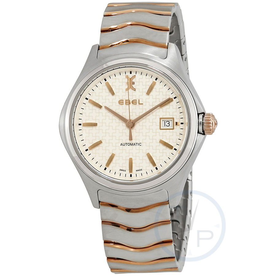 Stainless steel case with a stainless steel bracelet with 18kt rose gold bars. Fixed stainless steel bezel with an 18kt rose gold inlay. Silver (Swiss edition ) dial with rose gold-tone hands and index hour markers. Minute markers around the outer rim. Dial Type: Analog. Date display at the 3 o'clock position. Automatic movement. Scratch resistant sapphire crystal. Screw down crown. Transparent case back. Round case shape. Case size: 41 mm. Case thickness: 11 mm. Band width: 20 mm. Hidden fold over clasp. Water resistant at 50 meters / 165 feet. Functions: date, hour, minute, second. Dress watch style. Watch label: Swiss Made. Ebel Wave Swiss Edition Dial Automatic Mens Watch 1216274.
