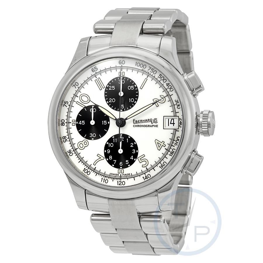 Stainless steel case with a stainless steel bracelet. Fixed stainless steel bezel. White dial with luminous black hands and Arabic numeral hour markers. Minute markers. Tachymeter markings around the outer rim. Dial Type: Analog. Luminescent hands and markers. Date display at the 3 o'clock position. Chronograph - three black sub-dials displaying: 60 second, 30 minute and 12 hours. Automatic movement with a 46-hour power reserve. Scratch resistant sapphire crystal. Screw down crown. Transparent case back. Round case shape. Case size: 43 mm. Band width: 21 mm. Fold over clasp with a push button release. Water resistant at 50 meters / 165 feet. Functions: chronograph, tachymeter, date, hour, minute, second. Sport watch style. Watch label: Swiss Made. Eberhard and Co Traversetolo Chronograph Automatic Mens Watch 31051.2.