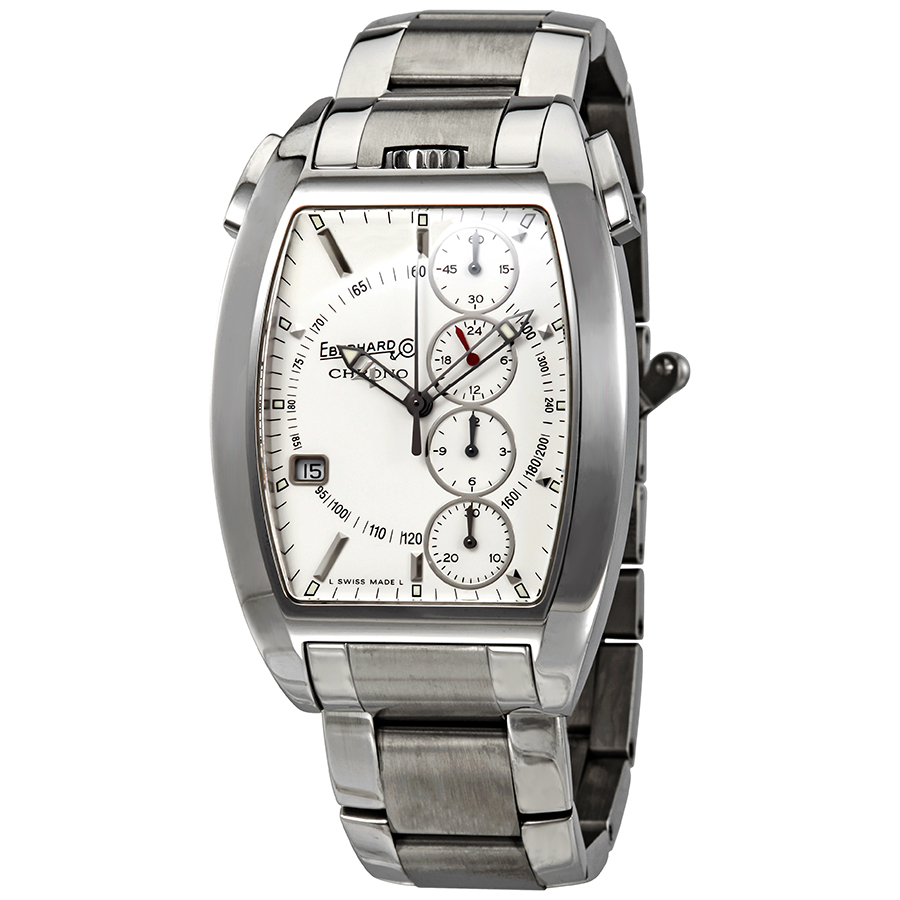Stainless steel case with a stainless steel bracelet. Fixed stainless steel bezel. White dial with grey skeleton hands and index hour markers. Tachymeter markings around an inner ring. Minute markers around the outer rim. Dial Type: Analog. Luminescent hands and markers. Date display at the 8 o'clock position. Chronograph - four sub-dials displaying: 60 second, 24 hour, 12 hour and 30 minute. Eberhard calibre EB250 automatic movement with a 42-hour power reserve. Scratch resistant sapphire crystal. Solid case back. Tonneau case shape. Case dimensions: 55 mm x 37 mm. Case thickness: 13 mm. Band width: 20 mm. Deployment DeClic clasp. Water resistant at 30 meters / 100 feet. Functions: chronograph, date, GMT, second time zone, hour, minute, small second. Sport watch style. Watch label: Swiss Made. Eberhard and Co Chrono 4 Chronograph Automatic White Dial Mens Watch 31047.1.