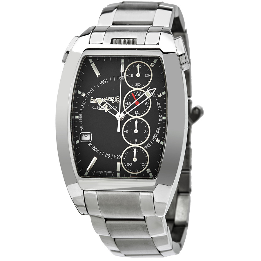 Stainless steel case with a stainless steel bracelet. Fixed stainless steel bezel. Black dial with silver-tone skeleton hands and index hour markers. Tachymeter markings around an inner ring. Minute markers around the outer rim. Dial Type: Analog. Luminescent hands and markers. Date display at the 8 o'clock position. Chronograph - four sub-dials displaying: 60 second, 24 hour, 12 hour and 30 minute. Eberhard calibre EB250 automatic movement with a 42-hour power reserve. Scratch resistant sapphire crystal. Pull / push crown. Solid case back. Tonneau case shape. Case dimensions: 55 mm x 37 mm. Case thickness: 13 mm. Band width: 20 mm. Deployment DeClic clasp. Water resistant at 30 meters / 100 feet. Functions: chronograph, date, GMT, second time zone, hour, minute, small second. Sport watch style. Watch label: Swiss Made. Eberhard and Co Chrono 4 Chronograph Automatic Black Dial Mens Watch 31047.2.