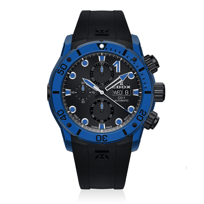 Black carbon case with a black rubber strap. Uni-directional rotating blue PVD bezel. Black dial with luminous silver-tone hands and dot hour markers. Minute markers around the outer rim. Dial Type: Analog. Luminescent hands and markers. Day date display at the 3 o'clock position. Edox caliber 011 automatic movement with a 48-hour power reserve. Scratch resistant sapphire crystal. Screw down crown. Transparent case back. Round case shape. Case size: 45 mm. Case thickness: 16.9 mm. Band width: 20 mm. Fold over clasp. Water resistant at 500 meters / 1650 feet. Functions: chronograph, hour, minute, second. Additional Info: 25 jewels frequency : 28'800 a/h helium valve, screw-down push-buttons, PVD/dlc coating. Dive watch style. Watch label: Swiss Made. Edox Chronograph Automatic Black Dial Watch 01125 CLNBUN NINBU.