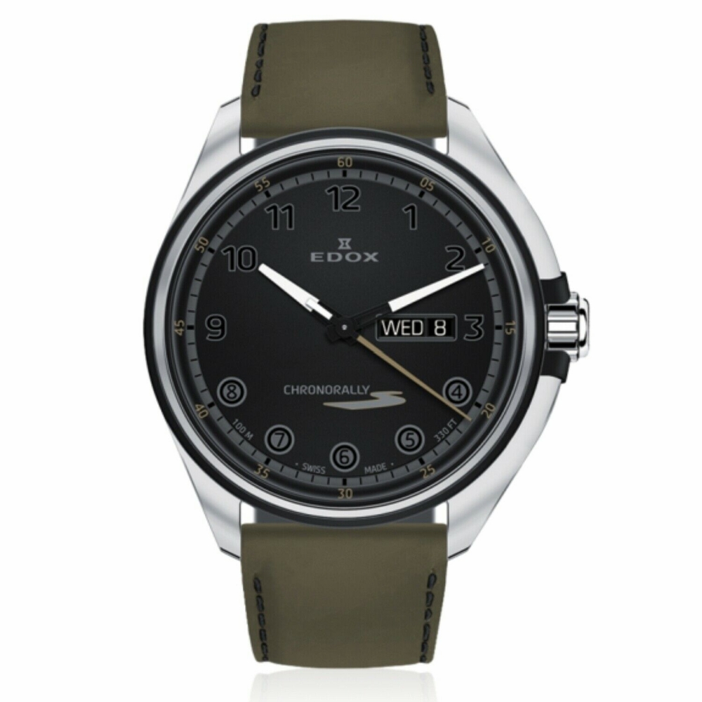 Stainless steel case with a green leather strap. Fixed stainless steel bezel with an inlaid black ring. Black dial with luminous hands and Arabic numeral hour markers. Minute markers. Arabic numeral minute markers (at 5 minute intervals) around the outer rim. Dial Type: Analog. Luminescent hands. Day of the week and date display at the 3 o'clock position. Quartz movement. Scratch resistant sapphire crystal. Pull / push crown. Solid case back. Round case shape. Case size: 43 mm. Case thickness: 9.7 mm. Band width: 22 mm. Tang clasp. Water resistant at 100 meters / 330 feet. Functions: date, day, hour, minute, second. Chronorally-s Series. Dress watch style. Watch label: Swiss Made. Edox Chronorally S Quartz Black Dial Mens Watch 84301 3NCV NNV.