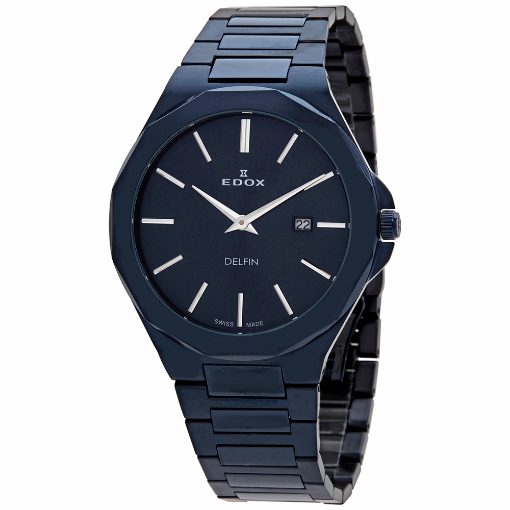 Blue-plated stainless steel case and bracelet. Fixed blue-plated bezel. Blue dial with silver-tone hands and index hour markers. Dial Type: Analog. Date display at the 3 o'clock position. Quartz movement. Scratch resistant sapphire crystal. Pull / push crown. Solid case back. Dodecagon case shape. Case size: 41 mm. Butterfly clasp. Water resistant at 30 meters / 100 feet. Functions: date, hour, minute, second. Delfin Series. Casual watch style. Watch label: Swiss Made. Edox Delfin Quartz Blue Dial Mens Watch 71289 37BUM BUIN.