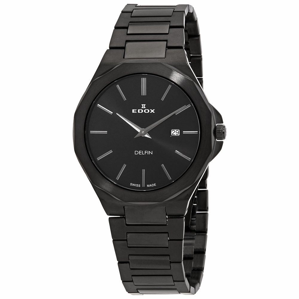 Black PVD stainless steel case and bracelet. Fixed black PVD bezel. Black dial with silver-tone hands and index hour markers. Dial Type: Analog. Date display at the 3 o'clock position. Quartz movement. Scratch resistant sapphire crystal. Pull / push crown. Solid case back. Dodecagon case shape. Case size: 41 mm. Butterfly clasp. Water resistant at 30 meters / 100 feet. Functions: date, hour, minute. Delfin Series. Casual watch style. Watch label: Swiss Made. Edox Delfin Quartz Black Dial Mens Watch 71289 37NM NIG.