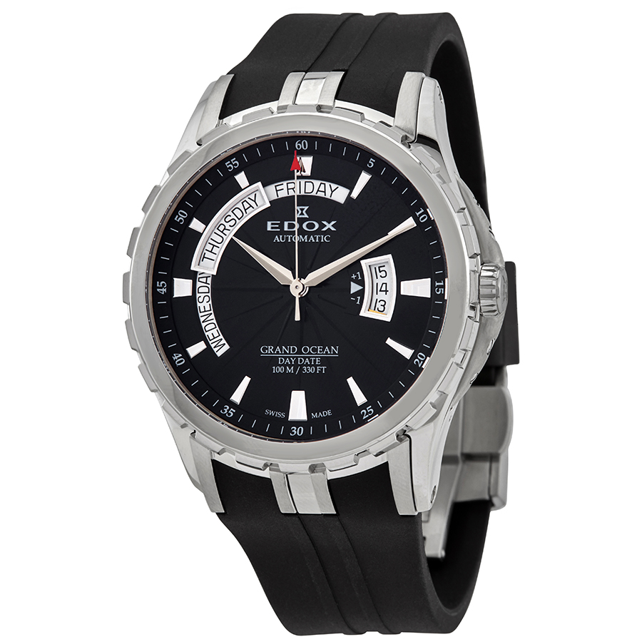 Silver-tone stainless steel case with a black rubber strap. Black dial with index hour markers. Minute markers around the outer rim. Dial Type: Analog. Date display at the 3 o'clock position. Automatic movement. Scratch resistant sapphire crystal. Round case shape, case size: 45 mm, case thickness: 12 mm. Water resistant at 100 meters / 330 feet. Functions: date, day, hour, minute, second. Watch label: Swiss Made. Edox Grand Ocean Automatic Black Dial Mens Watch 83006 3CA NIN.