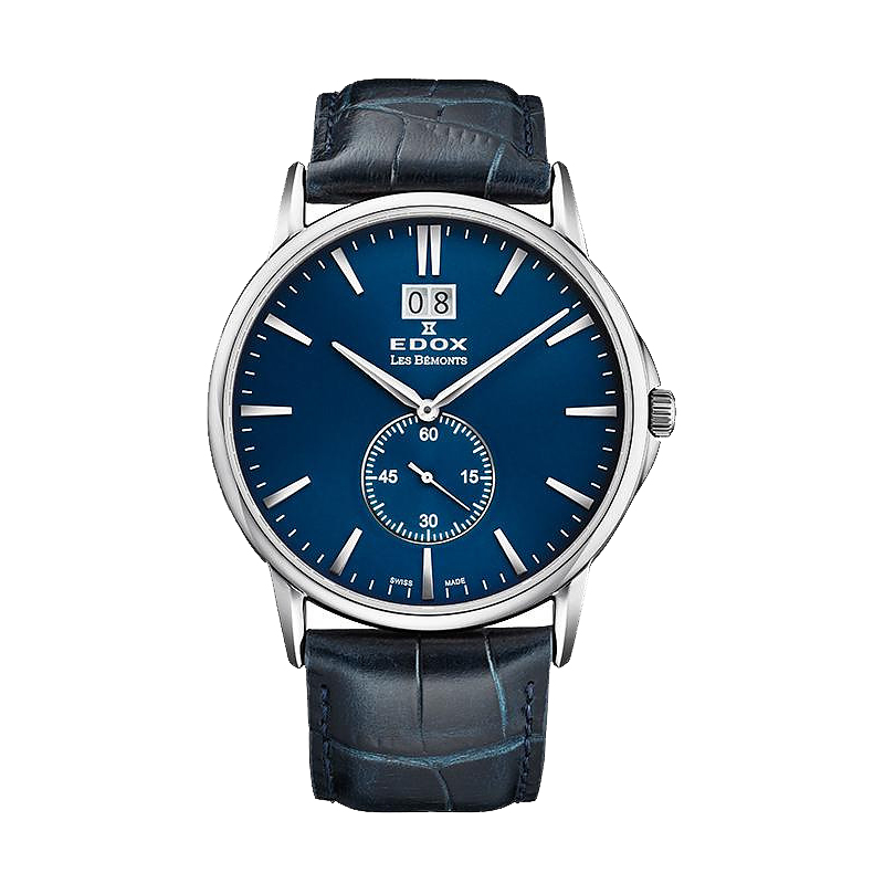 Silver-tone stainless steel case with a blue leather strap. Fixed silver-tone bezel. Blue dial with silver-tone hands and index hour markers. Dial Type: Analog. Date display at the 12 o'clock position. 60 seconds subdials. Quartz movement. Scratch resistant sapphire crystal. Pull / push crown. Solid case back. Round case shape, case size: 40 mm. Buckle clasp. Water resistant at 30 meters / 100 feet. Functions: date, hour, minute. Les Bemonts Big Date Series. Casual watch style. Watch label: Swiss Made. Edox Les Bemonts Big Date Quartz Blue Dial Mens Watch 64012 3 BUIN.