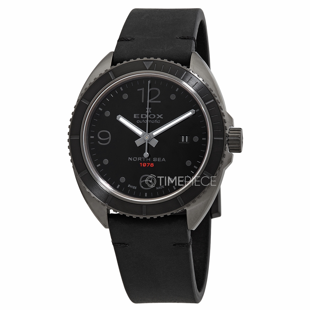 Stainless steel case with a black leather strap. Uni-directional rotating black ceramic bezel. Black dial with gunmetal hands and index hour markers. Arabic numeral markers at the 6, 9 and 12 o'clock positions. Minute markers around the outer rim. Dial Type: Analog. Date display at the 3 o'clock position. Sellita Caliber SW200 Automatic movement, containing 26 Jewels, bitting at 28800 vph, and has a power reserve of approximately 38 hours. Scratch resistant sapphire crystal. Screw down crown. Solid case back. Round case shape, case size: 43 mm. Water resistant at 300 meters / 1000 feet. Functions: date, hour, minute, second. Additional Info: 1978 limited edition. North Sea 1978 Series. Sport watch style. Watch label: Swiss Made. Edox North Sea 1978 Automatic Black Dial Mens Watch 80118 357NG N1.