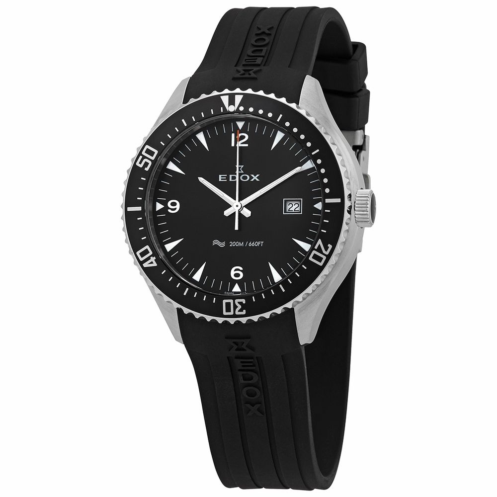 Stainless steel case with a black rubber strap. Uni-directional rotating stainless steel bezel with an inlaid black ring. Black dial with silver-tone hands and index hour markers. Arabic numerals appear at the 6, 9 and 12 o'clock positions. Minute markers around the outer rim. Dial Type: Analog. Luminescent hands and markers. Date display at the 3 o'clock position. Edox calibre 53 quartz movement. Scratch resistant sapphire crystal. Pull / push crown. Solid case back. Round case shape. Case size: 44 mm. Case thickness: 13 mm. Band width: 21 mm. Fold over clasp. Water resistant at 200 meters / 660 feet. Functions: date, hour, minute, second. Casual watch style. Watch label: Swiss Made. Edox Quartz Black Dial Black Rubber Mens Watch 53016-3CA-NIN.
