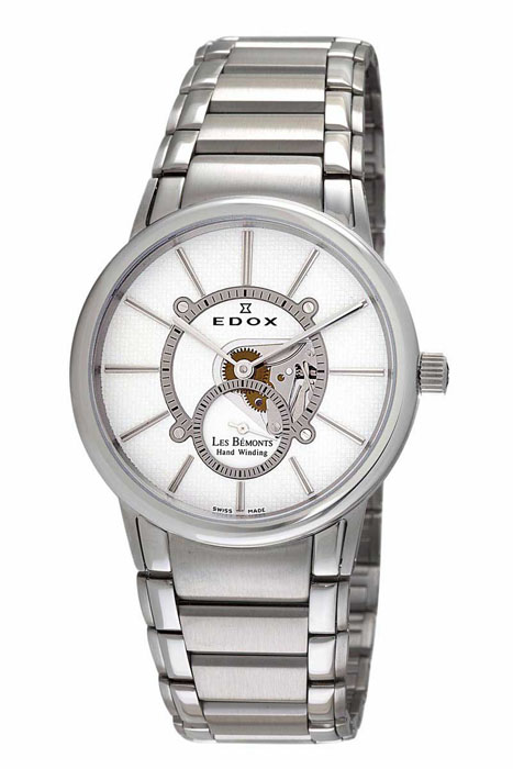 . Stainless steel case with a stainless steel bracelet. Fixed stainless steel bezel. White dial with silver-tone hands and index hour markers. Minute markers around an inner ring. Dial Type: Analog. Luminescent hands and markers. Seconds sub-dial at the 6 o'clock position. Automatic movement. Scratch resistant sapphire crystal. Pull / push crown. Skeleton window case back. Case diameter: 39 mm. Case thickness: 7 mm. Round case shape. Band width: 25 mm. Band length: 8 inches. Deployment clasp. Water resistant at 30 meters (100 feet). Functions: hour, minute, second. Additional Info: withstands rain and splashes of water, but not showering or submersion. Dress watch style. Watch label: Swiss Made. Edox Les Bemonts White Dial Stainless Steel Mens Watch 72011 3 AIN.