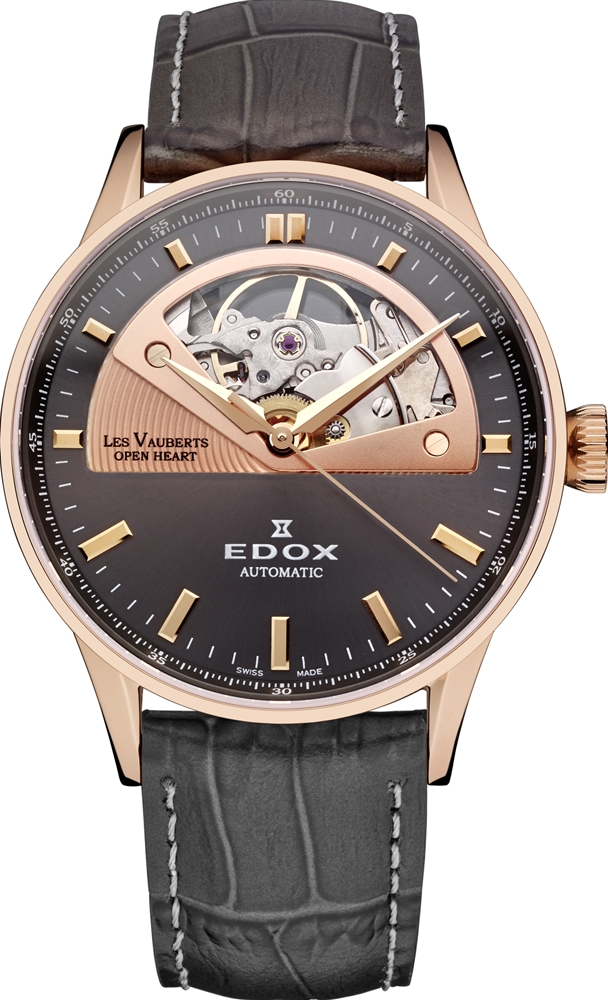 Rose gold-tone PVD stainless steel case with a grey leather strap. Fixed stainless steel bezel. Grey dial with gold-tone hands and index hour markers. Minute markers around the outer rim. Dial Type: Analog. Edox Calibre 85 automatic movement with a 42-hour power reserve. Scratch resistant sapphire crystal. Case size: 37 mm. Case thickness: 9.5 mm. Round case shape. Water resistant at 50 meters / 165 feet. Functions: hour, minute, second. Dress watch style. Watch label: Swiss Made. Edox Les Vauberts Open Heart Grey Dial Automatic Ladies Watch 85019 37RG GIR.