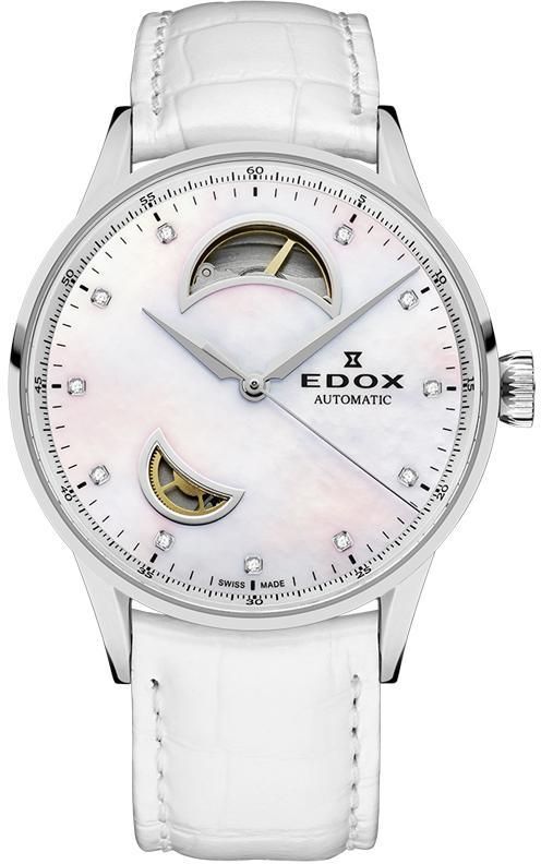 Silver-tone stainless steel case with a white leather strap. Fixed stainless steel bezel. White mother of pearl dial with silver-tone hands. Minute markers around the outer rim. Dial Type: Analog. Edox Calibre 85 automatic movement with a 42-hour power reserve. Scratch resistant sapphire crystal. Case size: 37 mm. Round case shape. Water resistant at 50 meters / 165 feet. Functions: hour, minute, second. Dress watch style. Watch label: Swiss Made. Edox Les Vauberts Open Heart White Mother of Pearl Dial Ladies Watch 85019 3A NADN.