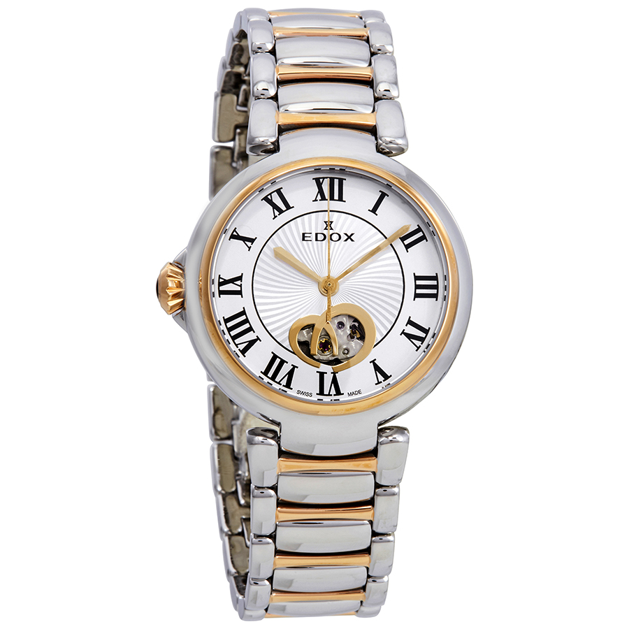 Silver and gold-tone stainless steel case with a silver and gold-tone stainless steel bracelet. Fixed stainless steel bezel. Silver dial with gold-tone hands and Roman numeral hour markers. Dial Type: Analog. Edox Calibre 85 automatic movement with a 42-hour power reserve. Scratch resistant sapphire crystal. Case size: 33 mm. Round case shape. Water resistant at 50 meters / 165 feet. Functions: hour, minute, second. Dress watch style. Watch label: Swiss Made. Edox LaPassion Open Heart Silver Dial Automatic Ladies Two Tone Watch 85025 357RM ARR.
