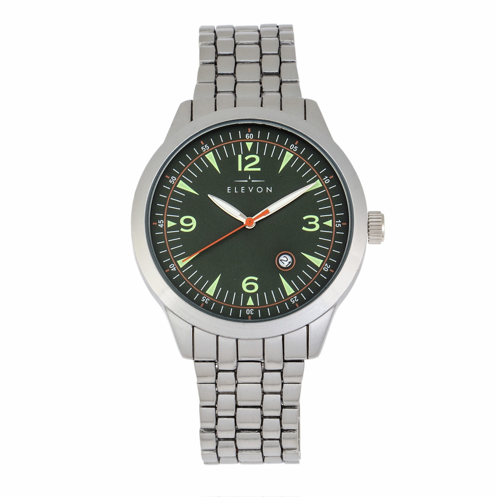 Silver-tone alloy case with a silver-tone alloy bracelet. Fixed silver-tone alloy bezel. Green dial with silver-tone hands and Arabic numeral and index hour markers. Minute markers around the outer rim. Dial Type: Analog. Luminescent hands and markers. Date display between 4 and 5 o'clock position. Quartz movement. Scratch resistant mineral crystal. Pull / push crown. Solid case back. Round case shape, case size: 42 mm, case thickness: 10 mm. Band width: 19 mm. Push button deployment clasp. Water resistant at 50 meters / 165 feet. Functions: date, hour, minute, second. Casual watch style. Watch label: Japan Movt. Item Variations: ELE119-2. Elevon Atlantic Quartz Green Dial Mens Watch ELE119-2.