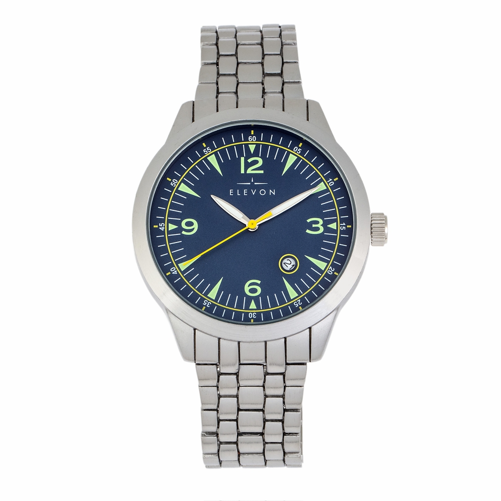 Silver-tone alloy case with a silver-tone alloy bracelet. Fixed silver-tone alloy bezel. Blue dial with silver-tone hands and Arabic numeral and index hour markers. Minute markers around the outer rim. Dial Type: Analog. Luminescent hands and markers. Date display between 4 and 5 o'clock position. Quartz movement. Scratch resistant mineral crystal. Pull / push crown. Solid case back. Round case shape, case size: 42 mm, case thickness: 10 mm. Band width: 19 mm. Push button deployment clasp. Water resistant at 50 meters / 165 feet. Functions: date, hour, minute, second. Casual watch style. Watch label: Japan Movt. Item Variations: ELE119-4. Elevon Atlantic Quartz Blue Dial Mens Watch ELE119-4.