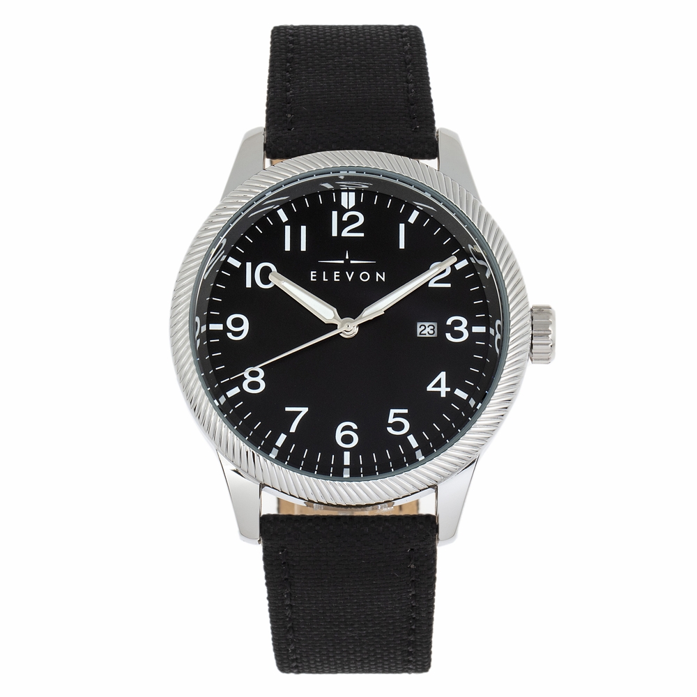 Silver-tone alloy case with a black genuine leather strap. Fixed silver-tone alloy bezel. Black dial with silver-tone hands and Arabic numeral hour markers. Minute markers around the outer rim. Dial Type: Analog. Luminescent hands. Date display at the 3 o'clock position. Quartz movement. Scratch resistant mineral crystal. Pull / push crown. Solid case back. Round case shape, case size: 42 mm, case thickness: 10 mm. Band width: 20 mm. Buckle clasp. Water resistant at 50 meters / 165 feet. Functions: date, hour, minute, second. Casual watch style. Watch label: Japan Movt. Item Variations: ELE118-2. Elevon Bandit Quartz Black Dial Mens Watch ELE118-2.