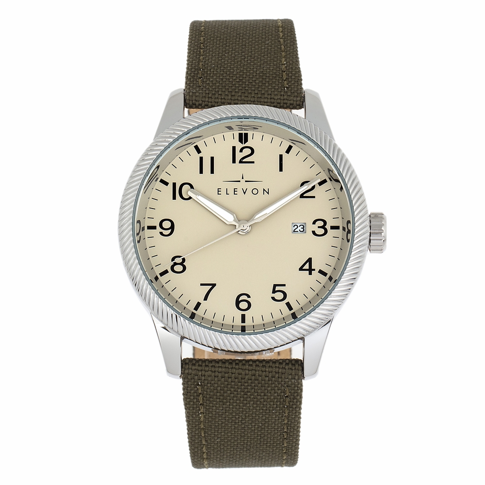 Silver-tone alloy case with a olive genuine leather strap. Fixed silver-tone alloy bezel. Tan dial with silver-tone hands and Arabic numeral hour markers. Minute markers around the outer rim. Dial Type: Analog. Luminescent hands. Date display at the 3 o'clock position. Quartz movement. Scratch resistant mineral crystal. Pull / push crown. Solid case back. Round case shape, case size: 42 mm, case thickness: 10 mm. Band width: 20 mm. Buckle clasp. Water resistant at 50 meters / 165 feet. Functions: date, hour, minute, second. Casual watch style. Watch label: Japan Movt. Item Variations: ELE118-5. Elevon Bandit Quartz Mens Watch ELE118-5.