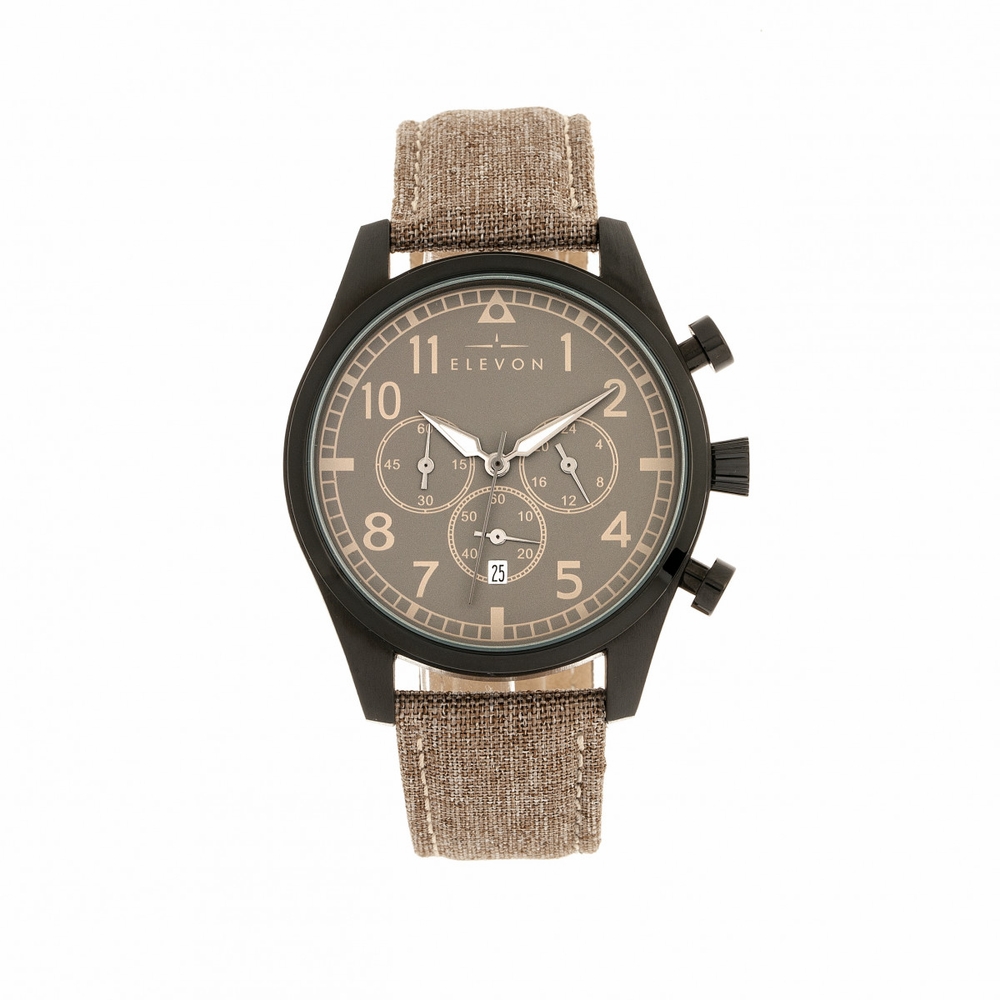 Black alloy case with a beige genuine leather strap. Fixed black alloy bezel. Pewter dial with silver-tone hands and Arabic numeral hour markers. Minute markers around the outer rim. Dial Type: Analog. Luminescent hands. Date display at the 6 o'clock position. Chronograph - sub-dials displaying: three - 60 second, 60 minute and 24 hour. Quartz movement. Scratch resistant mineral crystal. Pull / push crown. Solid case back. Round case shape, case size: 45 mm, case thickness: 11 mm. Band width: 22 mm. Buckle clasp. Water resistant at 50 meters / 165 feet. Functions: date, GMT, second time zone, hour, minute, second. Sport watch style. Watch label: Japan Movt. Item Variations: ELE104-5. Elevon Curtiss Mens Watch ELE104-5.
