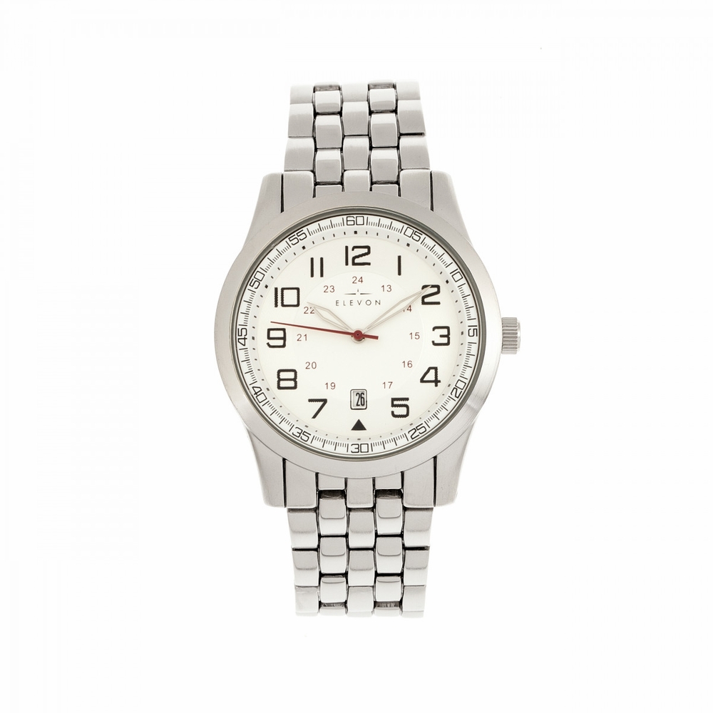 Silver-tone alloy case with a silver-tone alloy bracelet. Fixed silver-tone alloy bezel. White dial with silver-tone hands and Arabic numeral hour markers. Minute markers around the outer rim. Dial Type: Analog. Luminescent hands. Date display at the 6 o'clock position. Quartz movement. Scratch resistant mineral crystal. Pull / push crown. Solid case back. Round case shape, case size: 42 mm, case thickness: 10 mm. Band width: 22 mm. Fold over push button deployment clasp. Water resistant at 50 meters / 165 feet. Functions: date, hour, minute, second. Casual watch style. Watch label: Japan Movt. Item Variations: ELE105-1. Elevon Garrison White Dial Mens Watch ELE105-1.