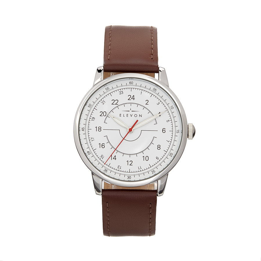 Silver-tone alloy case with a brown genuine leather strap. Fixed silver-tone alloy bezel. White dial with silver-tone leaf-style shape hands and Arabic numeral & index hour markers. Minute scale & 24 hour scale around the inner rim. Dial Type: Analog. Luminescent hands. Quartz movement. Scratch resistant mineral crystal. Pull / push crown. Solid case back. Round case shape, case size: 42 mm, case thickness: 9 mm. Band width: 20 mm, band length: 9 inches. Buckle clasp. Water resistant at 50 meters / 165 feet. Functions: hour, minute, second, 24 hour. Casual watch style. Watch label: Japan Movt. Elevon Gauge Quartz White Dial Mens Watch ELE122-1.