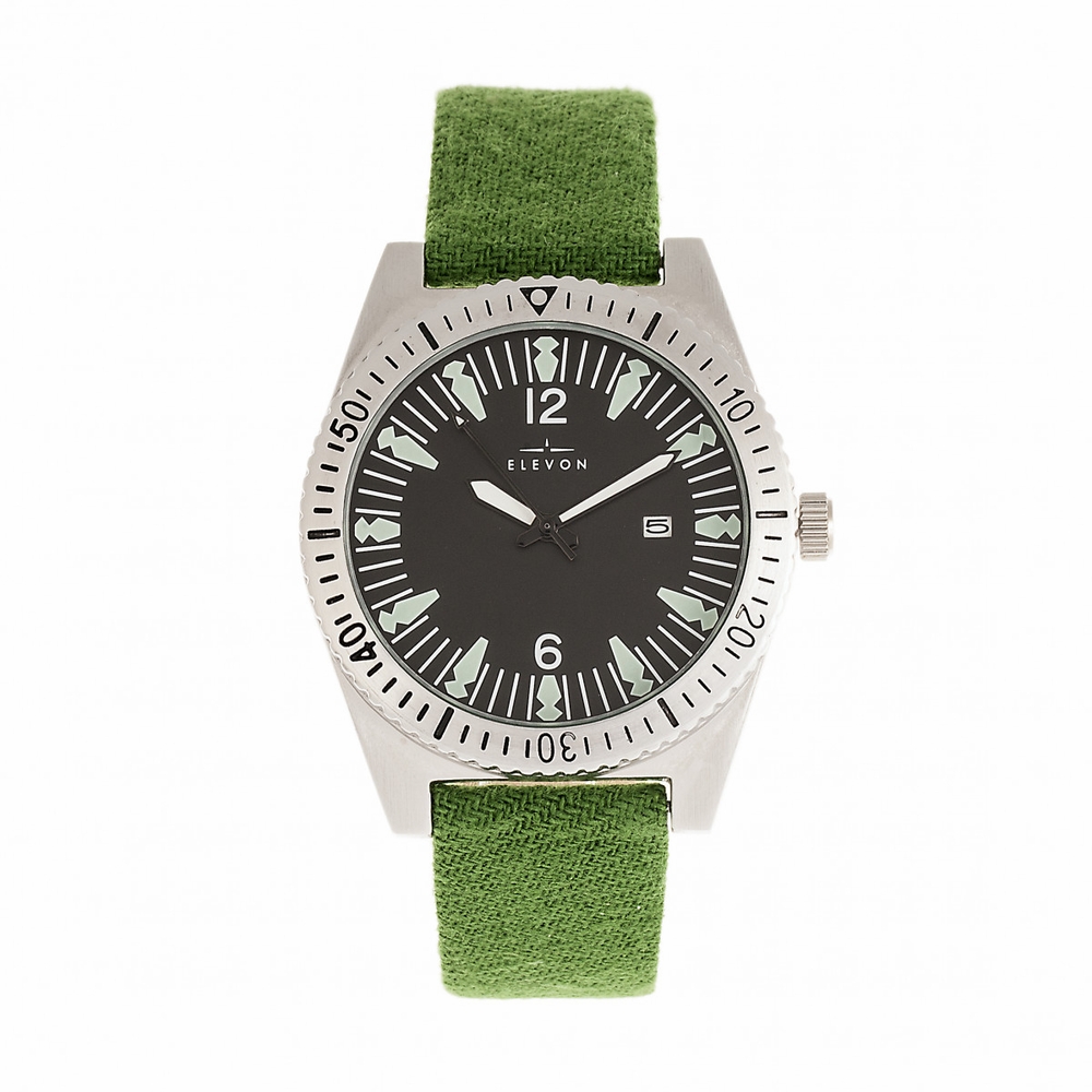 Silver-tone alloy case with a green alloy bracelet. Fixed silver-tone alloy bezel. Black dial with black hands and Arabic numeral and index hour markers. Minute markers around the outer rim. Dial Type: Analog. Luminescent hands and markers. Date display at the 3 o'clock position. Quartz movement. Scratch resistant mineral crystal. Pull / push crown. Solid case back. Tonneau case shape, case size: 42 mm, case thickness: 12 mm. Band width: 20 mm. Dual lock with safety clasp. Water resistant at 50 meters / 165 feet. Functions: date, hour, minute, second. Casual watch style. Watch label: Japan Movt. Item Variations: ELE114-5. Elevon Jeppesen Quartz Black Dial Mens Watch ELE114-5.