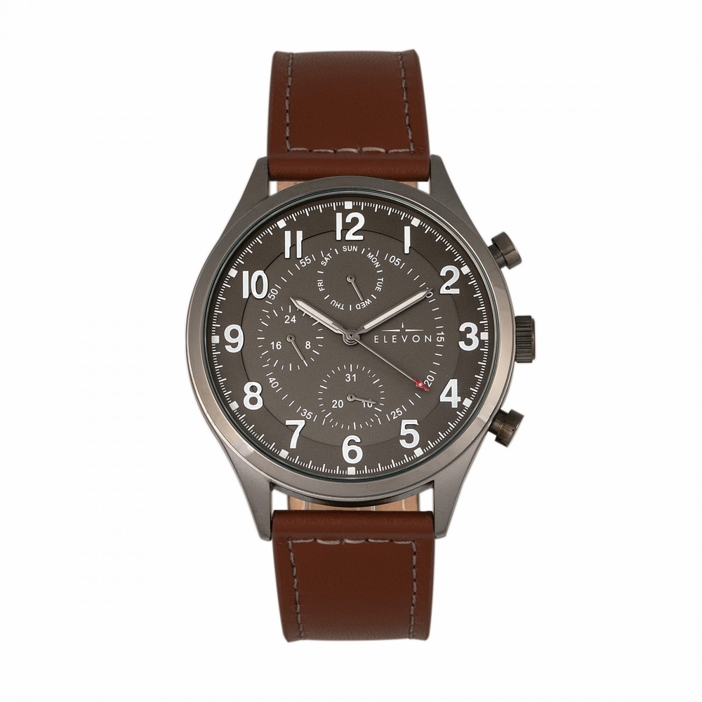 Gunmetal alloy case with a brown genuine leather strap. Fixed gunmetal alloy bezel. Grey dial with silver-tone hands and Arabic numeral hour markers. Minute markers around the outer rim. Dial Type: Analog. Luminescent hands. Date display at the 6 o'clock position. Three - date, day, 24 hour subdials. Quartz movement. Scratch resistant mineral crystal. Pull / push crown. Solid case back. Round case shape, case size: 45 mm, case thickness: 10 mm. Band width: 22 mm. Buckle clasp. Water resistant at 50 meters / 165 feet. Functions: GMT, second time zone, hour, minute, second. Sport watch style. Watch label: Japan Movt. Item Variations: ELE102-5. Elevon Lindbergh Grey Dial Mens Watch ELE102-5.