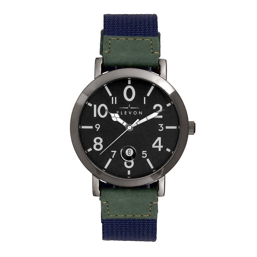 Gunmetal alloy case with a green canvas strap. Fixed gunmetal alloy bezel. Brown dial with silver-tone squelettes-shaped style hands and Roman numeral & index hour markers. Dial Type: Analog. Luminescent hands. Date display at the 6 o'clock position. Quartz movement. Scratch resistant mineral crystal. Pull / push crown. Solid case back. Round case shape, case size: 43 mm, case thickness: 10 mm. Band width: 21 mm, band length: 8.75 inches. Buckle clasp. Water resistant at 50 meters / 165 feet. Functions: date, hour, minute, second. Casual watch style. Watch label: Japan Movt. Elevon Mach 5 Quartz Brown Dial Mens Watch ELE123-4.