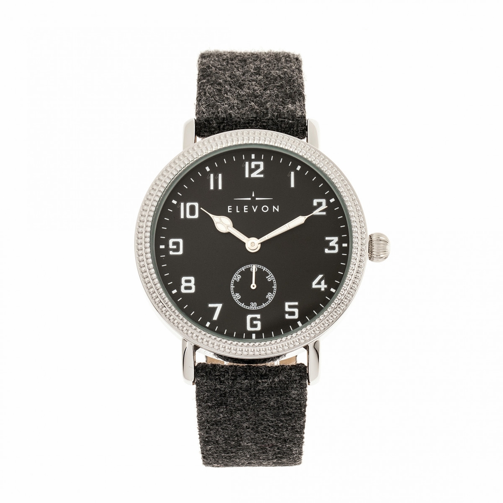 Silver-tone alloy case with a charcoal genuine leather strap. Fixed silver-tone alloy bezel. Black dial with silver-tone hands and Arabic numeral hour markers. Minute markers around the outer rim. Dial Type: Analog. Luminescent hands. One - small second subdial. Quartz movement. Scratch resistant mineral crystal. Pull / push crown. Solid case back. Round case shape, case size: 42 mm, case thickness: 11 mm. Band width: 20 mm. Buckle clasp. Water resistant at 50 meters / 165 feet. Functions: hour, minute, small second. Casual watch style. Watch label: Japan Movt. Item Variations: ELE110-2. Elevon Northrop Black Dial Mens Watch ELE110-2.