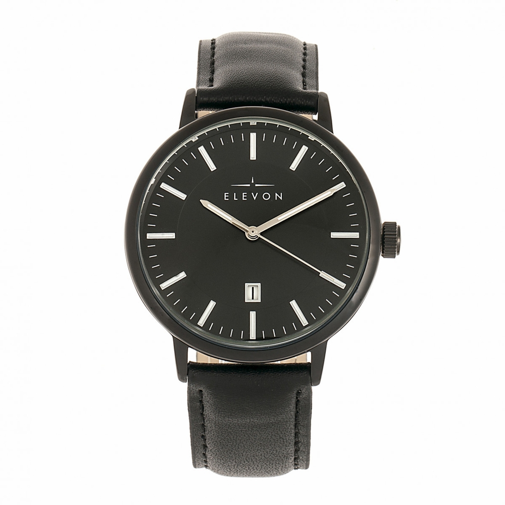Black alloy case with a black genuine leather strap. Fixed black alloy bezel. Black dial with silver-tone hands and index hour markers. Minute markers around the outer rim. Dial Type: Analog. Luminescent hands and markers. Date display at the 6 o'clock position. Quartz movement. Scratch resistant mineral crystal. Pull / push crown. Solid case back. Round case shape, case size: 42 mm, case thickness: 12 mm. Band width: 20 mm. Buckle clasp. Water resistant at 50 meters / 165 feet. Functions: date, hour, minute, second. Casual watch style. Watch label: Japan Movt. Item Variations: ELE111-5. Elevon Vin Quartz Black Dial Mens Watch ELE111-5.