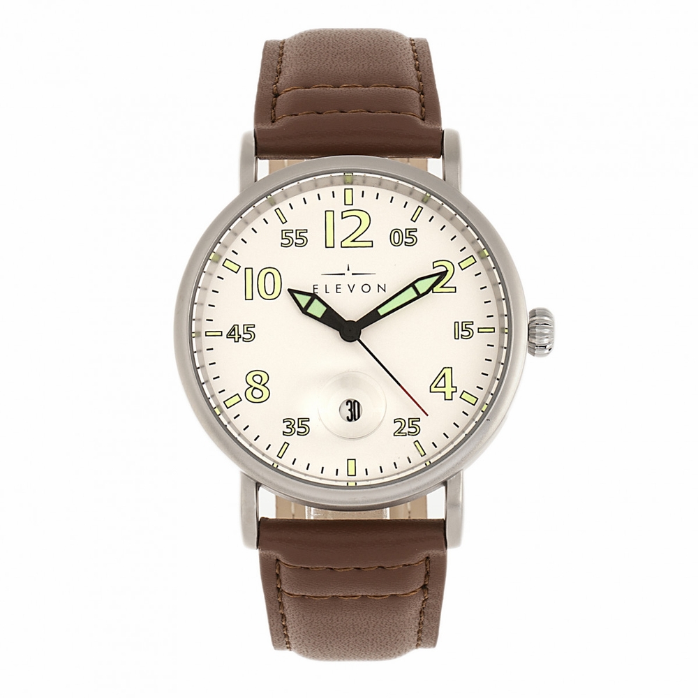 Silver-tone alloy case with a brown genuine leather strap. Fixed silver-tone alloy bezel. White dial with black hands and Arabic numeral hour markers. Minute markers around the outer rim. Dial Type: Analog. Luminescent hands and markers. Date display at the 6 o'clock position. Quartz movement. Scratch resistant mineral crystal. Pull / push crown. Solid case back. Round case shape, case size: 42 mm, case thickness: 12 mm. Band width: 23 mm. Buckle clasp. Water resistant at 50 meters / 165 feet. Functions: date, hour, minute, second. Casual watch style. Watch label: Japan Movt. Item Variations: ELE112-1. Elevon Von Braun Quartz White Dial Mens Watch ELE112-1.