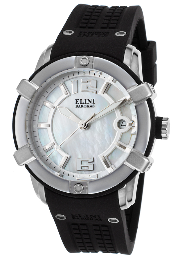 Stainless steel case with a black silicone strap. Fixed stainless steel bezel with a black silicone rim. Mother of pearl dial with luminous silver-tone hands and index hour markers. Arabic numerals mark the 6 and 12 o'clock positions. Minute markers around the outer rim. Dial Type: Analog. Luminescent hands and markers. Date display at the 3 o'clock position. ISA caliber 2331/00103/6000 quartz movement. Scratch resistant Sapphitek crystal. Pull / push crown. Screw down case back. Case size: 39 mm. Case thickness: 11 mm. Round case shape. Band width: 18 mm. Band length: 7.75 inches. Deployment clasp with a push button release. Water resistant at 100 meters / 330 feet. Functions: date, hour, minute, second. Sport watch style. Watch label: Swiss Movt. Elini Barokas Spirit Mother of Pearl Dial Ladies Watch ELINI-20005-02.